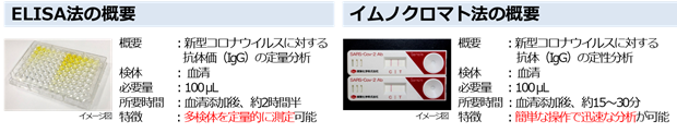 ELISA法は抗体価を定量分析するもので、検出感度が高く、かつ多検体の処理に向いています。また、ペア血清*4を用いた、病勢分析や治療効果の判定などにも活用できます。一方、イムノクロマト法は目視判定による定性分析が可能であるため、特別な装置を必要とせず、簡単な操作で短時間にウイルス感染の可能性を調べることができます。どちらも血液を用いる診断法のため、検体が採取しやすく、検体採取時の医療従事者などへの二次感染リスクが比較的低いことも特徴に挙げられます。